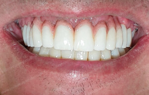 Bien évidemment cette première version de bridge transvissé sur les implants dentaires avec un cosmétique résilient n’est pas définitive, mais elle est suffisamment confortable pour être conservée les 6 à 12 mois de temps de cicatrisation, en attendant la pose du bridge implanto-porté avec un cosmétique en céramique définitif.