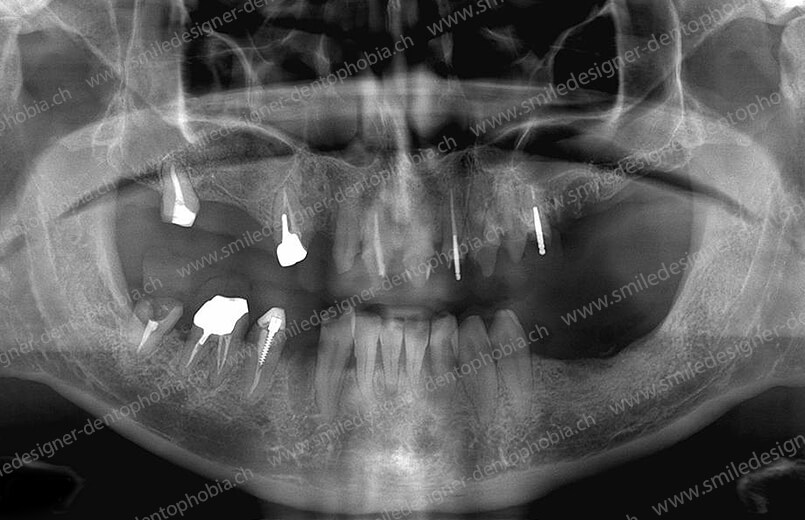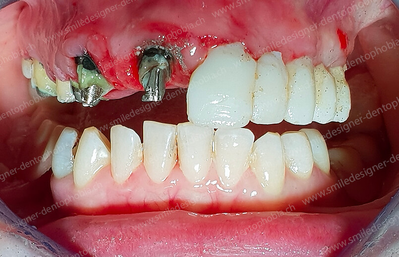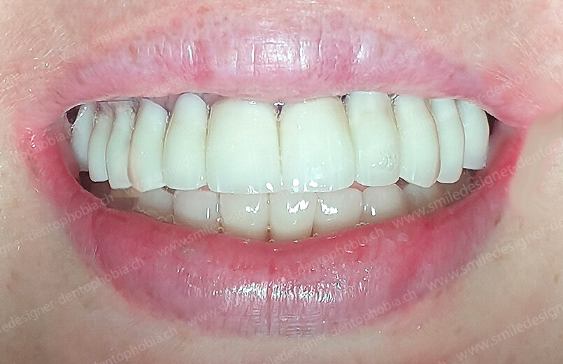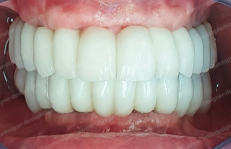 Cas clinique « DAMAGE CONTROL MCI » maxillaire : Bridge implanto-porté avec extensions postérieures (ALL ON 8) au maxillaire et à la mandibule. Version définitive des bridges avec un cosmétique en céramique.
