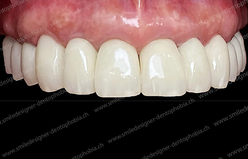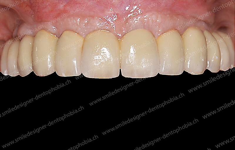 Cas clinique « GOLD STANDARD MCI » bi-maxillaire : Bridge implanto-porté sans extension postérieure (ALL ON 10). Version définitive des bridges avec un cosmétique en céramique.