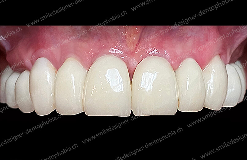 Cas clinique « GOLD STANDARD MCI » maxillaire : Bridge implanto-porté sans extension (ALL ON 8). Version définitive des bridges avec un cosmétique en céramique.