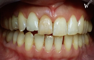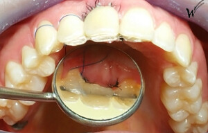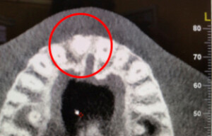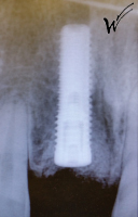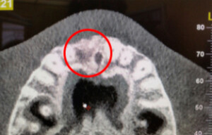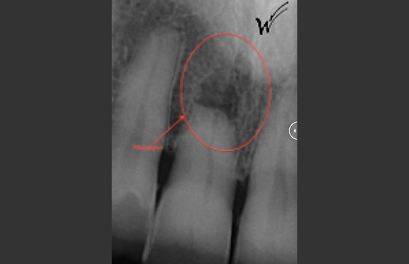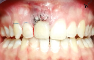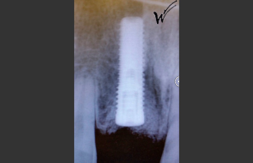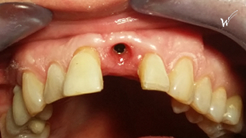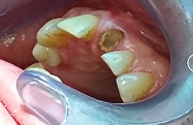En raison de problèmes de rhizalyse, une résorption pathologique de la racine, ainsi que d’une infection, l’incisive centrale du patient a été extraite.
