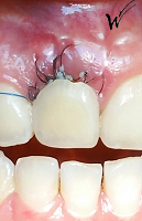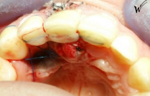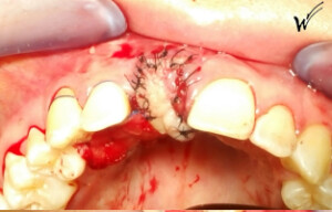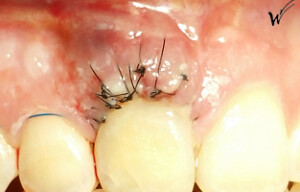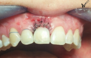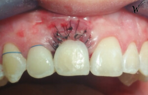 Lors de l’extraction, une greffe épithélio-conjonctive était nécessaire pour restaurer à la fois la hauteur du festonnage gingival et, bien sûr, les papilles gingivales qui disparaissent avec la dent extraite. J’ai choisi d’opter pour une greffe pédiculée avec un prélèvement au palais rétro-incisif.