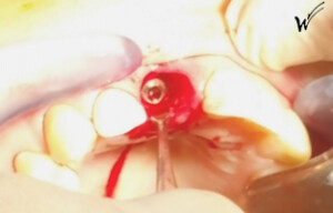 L’implant a été positionné dans l’alvéole, aligné avec la racine. À ce stade, un guide chirurgical peut s’avérer extrêmement utile, en particulier pour éviter d’éventuels obstacles anatomiques, tels que des paquets vasculo-nerveux situés dans le trou rétro-incisif.