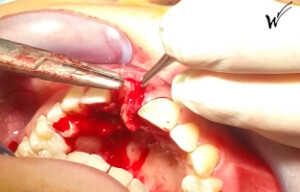 Pour restaurer l’alvéole dentaire dépeuplée après l’extraction de la racine, ainsi que la paroi osseuse externe (vestibulaire) de cette alvéole, et enfin pour sculpter la gencive autour de la couronne dentaire, une intervention de reconstruction osseuse et gingivale de l’alvéole est nécessaire. Cette intervention repose sur l’utilisation de techniques de greffes osseuses biosynthétiques, l’emploi de membranes PRF (Plasma Riche en Fibrine) contenant des facteurs de croissance plaquettaires favorisant la cicatrisation, ainsi que des injections de PRP (Plasma Riche en Plaquettes) pour stimuler la régénération des tissus mentionnés précédemment.