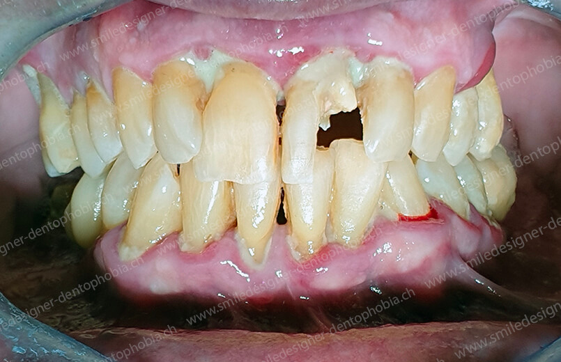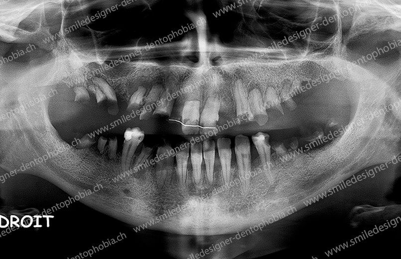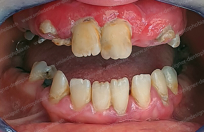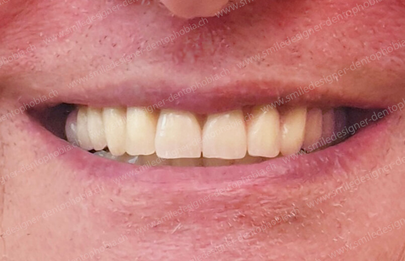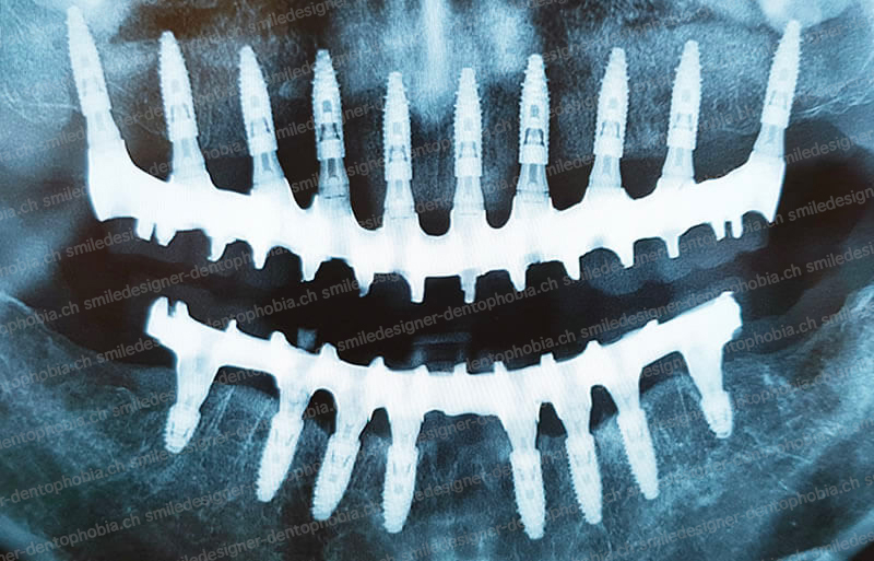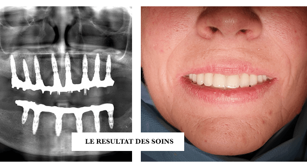- Première étape : pose de 6 implants au maxillaire et 6 à 8 implants à la mandibule dans la zone antérieure, pour restaurer immédiatement l’esthétique du sourire.