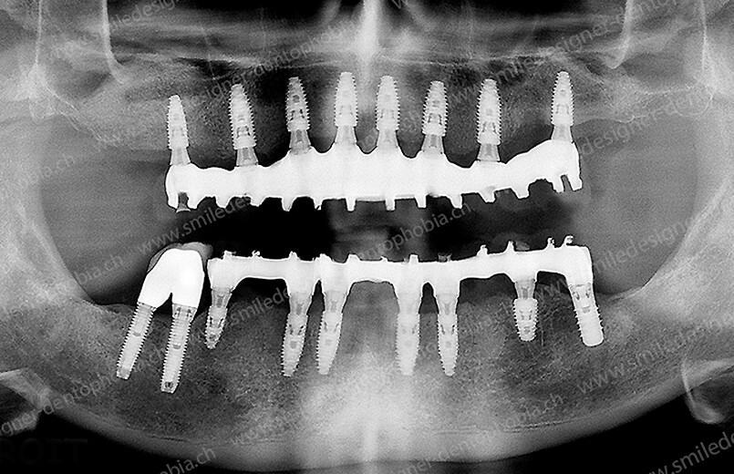 Version définitive des bridges avec un cosmétique en céramique (ALL ON 10/6). Double comblements de sinus et double greffes osseuses d’apposition pour la reconstruction du maxillaire.