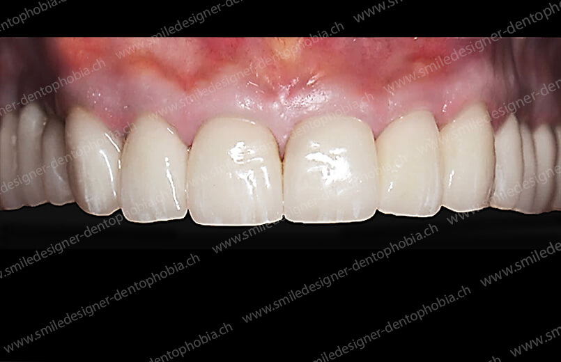 Une fausse gencive (de préférence en cosmétique céramique rose) appliquée sur le pourtour des dents en céramique du bridge implanto-porté, sera quelque fois une obligation esthétique.