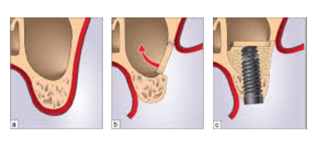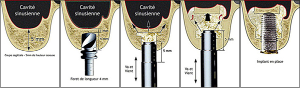 Le chirurgien-dentiste aborde le plancher du sinus par la crête alvéolaire en réalisant le puit de forage de l’implant dentaire, au niveau des dents et dans le même axe. Le forage de la loge de l’implant dentaire va jusqu’au plancher du sinus. Ensuite, le greffon osseux intra sinusien est poussé dans le sinus par le puit de forage du futur implant, en se servant d’ostéotomes et d’un marteau qui fracture et pousse le plancher sinusien et la membrane qui le tapisse.