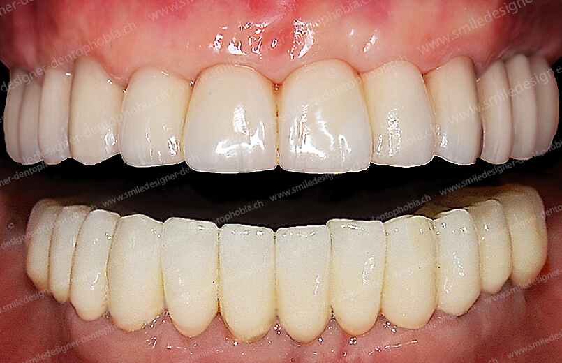 Après six à douze mois de cicatrisation les bridges résilients avec un cosmétique de type composite (matériaux hybrides) sont remplacés par des bridges définitifs implanto-portés, avec un cosmétique en céramique. Ils sont transvissés ou scellés, sur les implants dentaires sur toute la longueur de la mâchoire, de molaire à molaire, sans aucun porte à faux postérieurs.