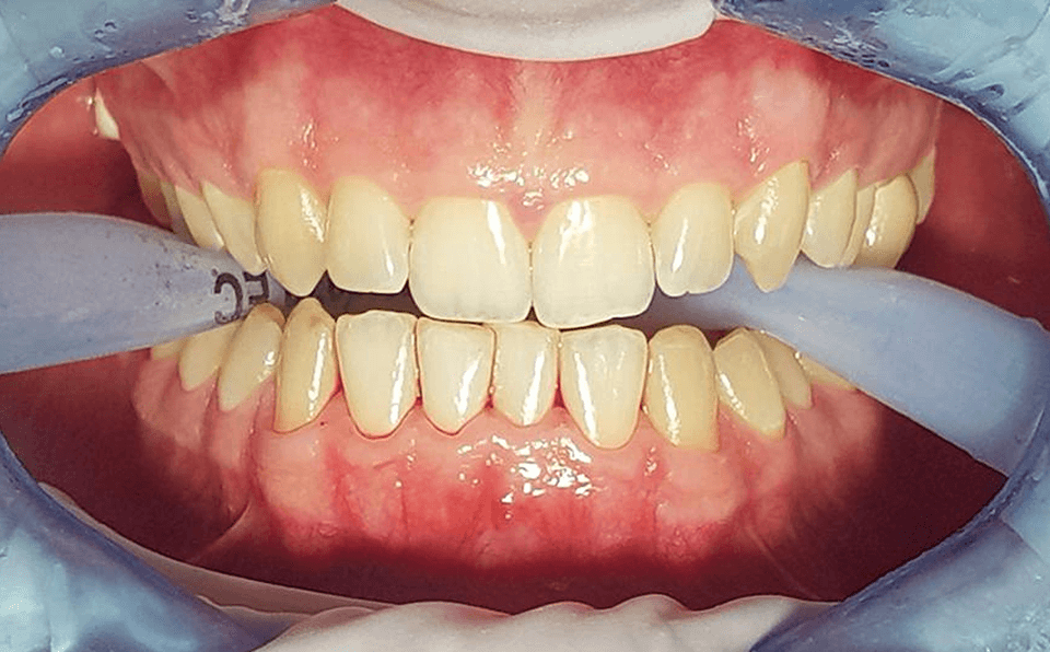 La séance débute par la protection de la gencive. Celle-ci s’effectue grâce à un pansement en mousse photo-polymérisée. Une fois les gencives parfaitement isolées, un gel de blanchiment contenant du peroxyde d’hydrogène est posé sur les dents.