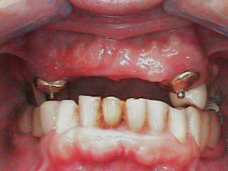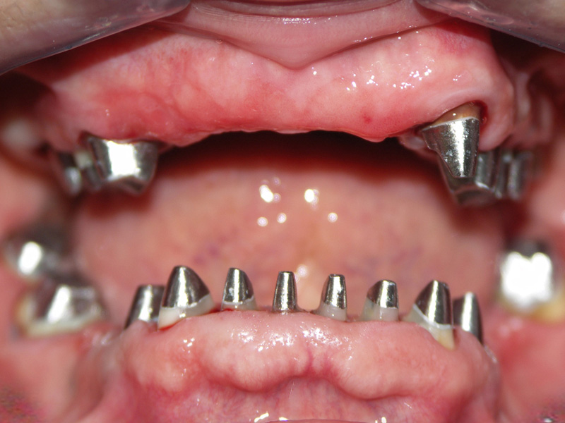 La patiente est arrivée partiellement édentée avec un appareil dentaire amovible sur la mâchoire supérieure.
