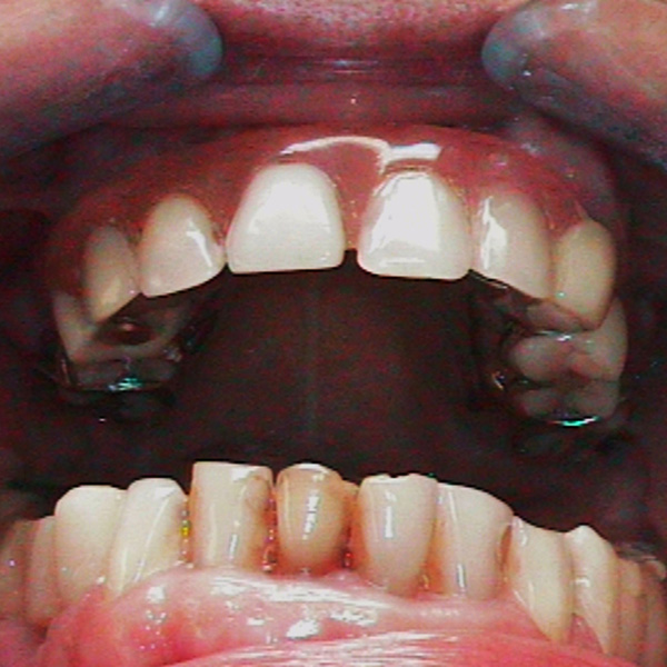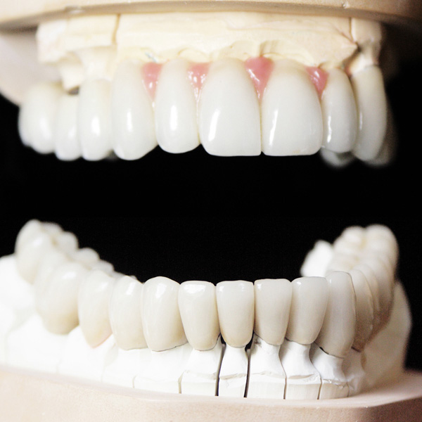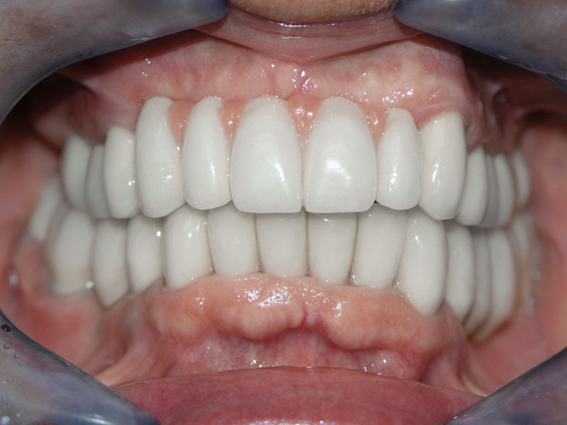 Lors de la conception et la réalisation des deux bridges céramiques complets haut et bas, la hauteur des couronnes céramiques esthétiques a été étudiée pour corriger et augmenter la dimension verticale d’occlusion ou DVO. Une reconstruction partielle des gencives sur le bridge supérieur par de la céramique rose pour compenser la perte de gencive est à remarquer.