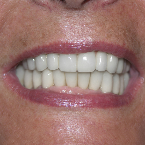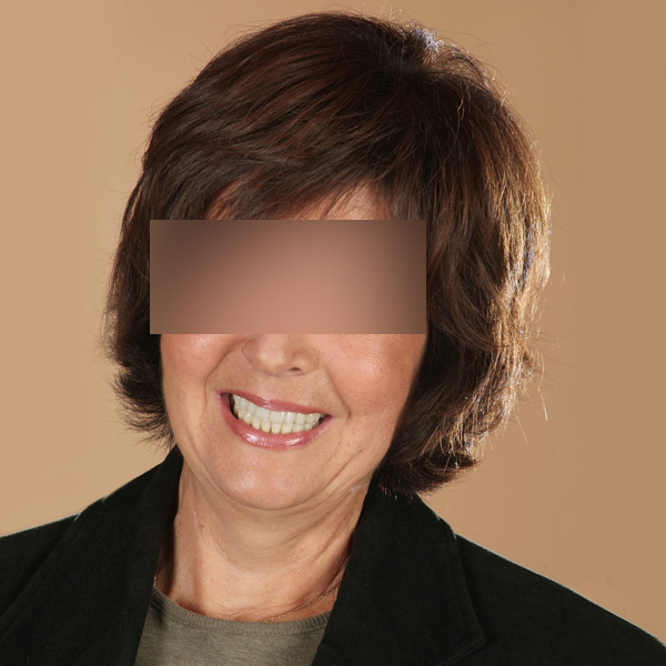 La série de photos suivantes présente la patiente en cours de traitement et à sa sortie du cabinet. La dimension verticale d’occlusion a été réhaussée correctement. Deux bridges complets en céramique ont remplacés les dents manquantes, restructurés le sourire et rajeunit l’aspect du visage.