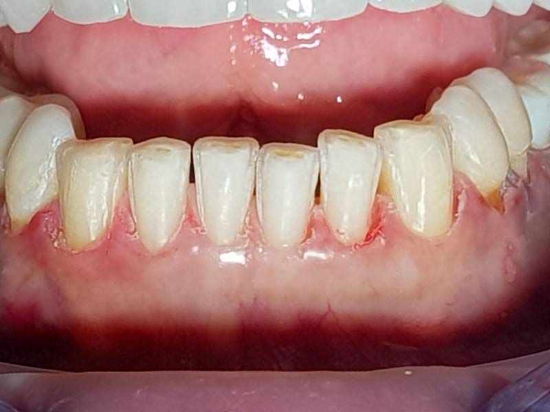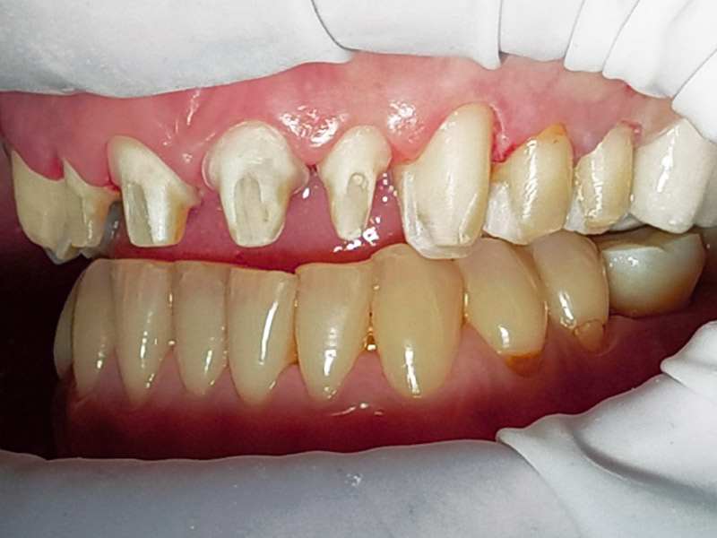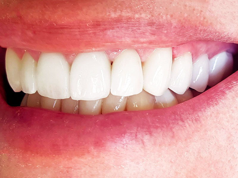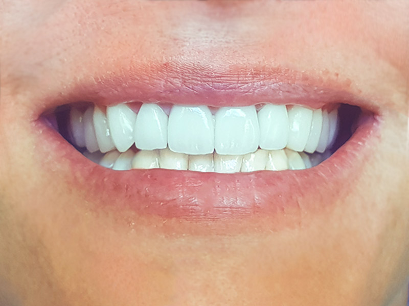La correction de la DVO, c'est à dire, la hauteur du bas du visage se fait grâce au rehaussement des dents par la pose de couronnes céramiques sur base zircone et le collage de facettes type “table top”(facette avec une face occlusale en céramique de type E-max) sur les dents postérieures usées.