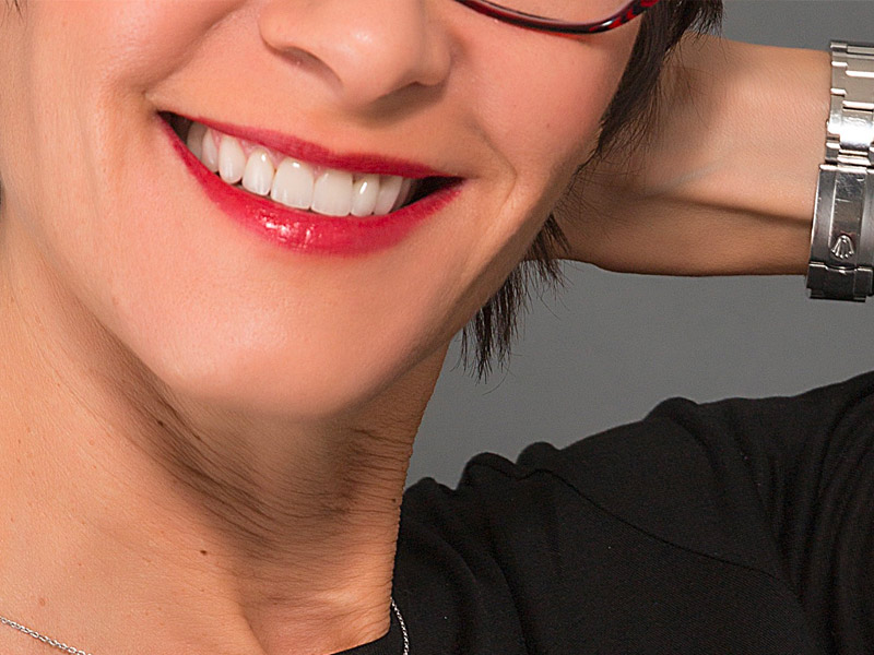 Une combinaison complexe de facettes céramiques feldspathiques sur mesure, de couronnes céramiques dans le même matériau et de couronnes 3/4 ou de table top en céramique E-max collées sur toutes les dents et y compris celles du sourire, ont permis de transformer l'expression de son visage. L'expression de son sourire est rajeunie et illuminée par des dents plus claires.