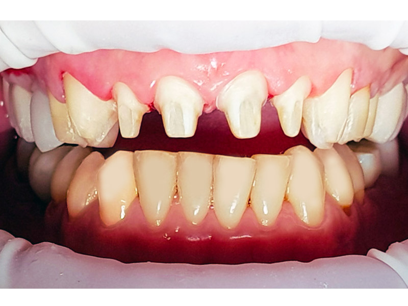 Voici un exemple de déroulement d’un cas clinique de dentisterie esthétique complexe qui conjugue la pose de facettes dentaires en céramique, de couronnes dentaires en céramique sur dents naturelles et de couronnes dentaires en céramique sur des implants dentaires.