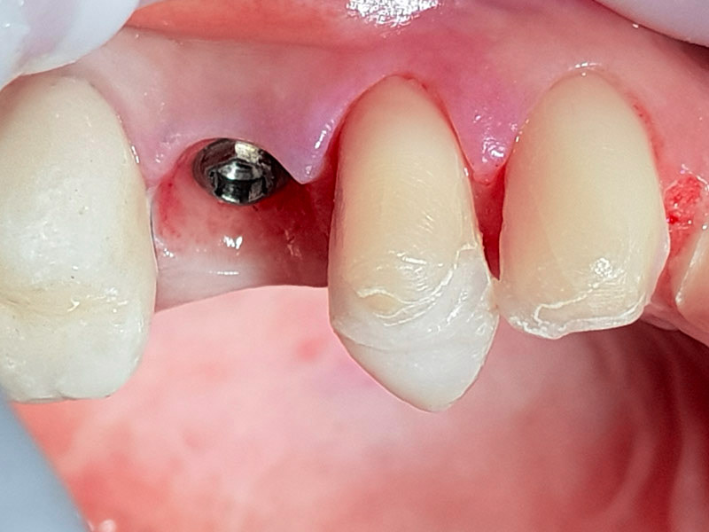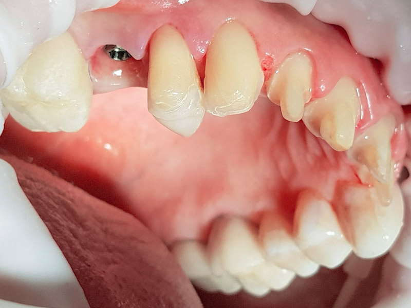 Une préparation psychologique et des sédations par IV avec nos médecins anesthésistes, selon notre protocole de narco-hypnose ont réglé le problème de la tachycardie et de la stomatophobie. Qui plus est, les sédations IV ont permis le compactage d'un volume de soins important, indispensable compte tenu de l'éloignement de cette patiente habitant en dehors de l'Europe.