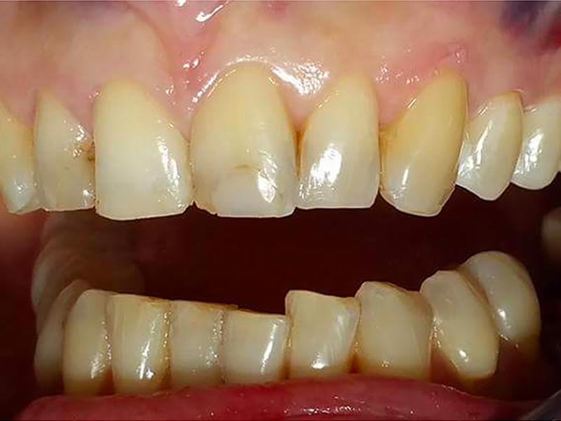 Le raccourcissement des dents et l'affaissement du bas du visage est dû à l'usure par attrition des molaires et prémolaires lors des crises de bruxisme nocturne.